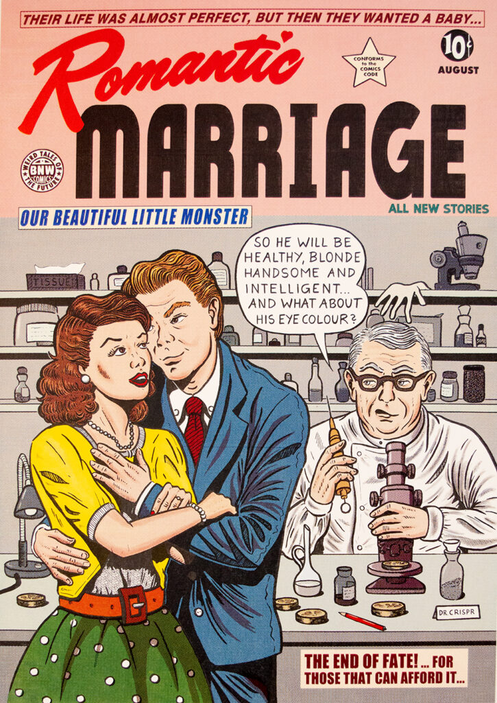 In this first part of the project CAN THIS BE TOMORROW? Michaela Konrad takes the viewer back to the golden 1950s. She shows a series of fictional comic book covers in the style of American Golden Age comic books. Inspired by fantasists like Aldous Huxley, George Orwell, or Phillip K. Dick, she creates a past vision of current events. The video work WILL THIS BE?, which is presented together with the hand-printed cover images, playfully addresses past prognoses regarding our present time.